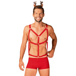 Der verspielte Herr Rentier hat Lust auf Spaß! Der würzige rote Harness und der verführerische Slip sind ein sehr sexy und sinnliches Paar, bereit für Unfug im Schlafzimmer. Der Haarreif mit Rentierohren ist ein äußerst charmantes Element, das das Outfit perfekt ergänzt.