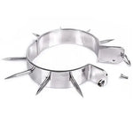 This chrome-plated metal collar is secured with the included Allen key. It features a shiny finish with pointed tips. The collar features an O-ring for attaching a snap chain, rope, or other bondage item.