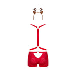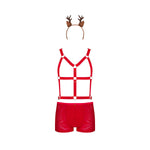 Playful Mr. Reindeer is ready for some fun! The spicy red harness and seductive panties make a very sexy and sensual pair, ready for mischief in the bedroom. The reindeer ear headband is an extremely charming element that perfectly complements the outfit.