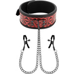 Bereit für maximales Vergnügen?, verbunden durch eine silberne Kette mit Nippelklemmen. Ein aufregendes Fesselspiel speziell für sie. Die Klemmen und der Kragen sind sowohl im Maß als auch in der Spannung verstellbar. Es eignet sich perfekt zur Stimulation der Brustwarzen und vieler anderer empfindlicher Bereiche.