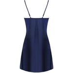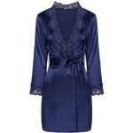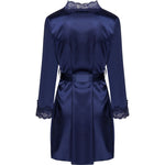 Ein außergewöhnlich schönes Dessous-Set aus glänzendem marineblauem Satin, ein Bademantel mit T-Shirt, der bis zur Mitte des Oberschenkels reicht. Die Vorderseite und die langen Ärmel des in der Taille mit einem Gürtel gebundenen Morgenmantels sind mit wunderschöner Spitze verziert. T-Shirt mit dünnen, verstellbaren Trägern, verziert mit der gleichen Spitze an der Brust. Inklusive Tanga.